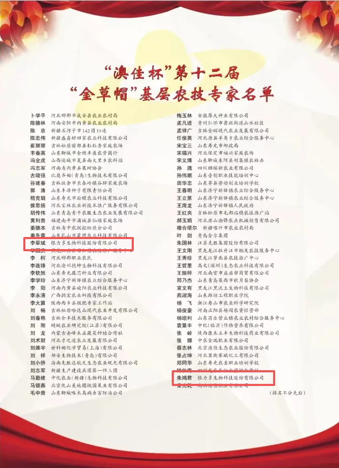 12月9日,第十二届寻找“金草帽”基层农技专家公益活动研讨会在北京圆满落幕。经过研讨委员会12位专家的严格评审,从全国99位候选人中评选出75位基层农技专家,授予第十二届“金草帽”荣誉称号。根力多生物科技股份有限公司的李翠斌、朱鸿君两位老师凭借扎实的技术能力和突出的基层服务成效,成功入选。这标志着根力多再添“金草帽”殊荣,也进一步彰显了其在农技人才培养与一线服务体系建设上的持续深耕。